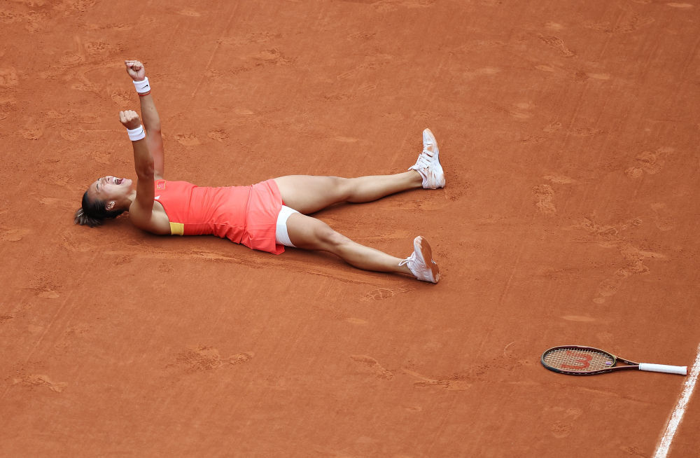 8月3日,郑钦文在巴黎奥运会网球女子单打金牌赛后庆祝夺冠。新华社记者 高静 摄