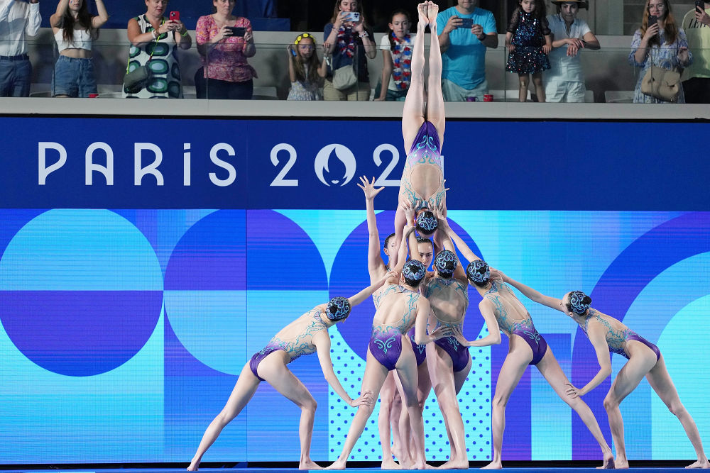 8月6日,中国队在巴黎奥运会花样游泳集体自由自选比赛中。新华社记者 薛宇舸 摄