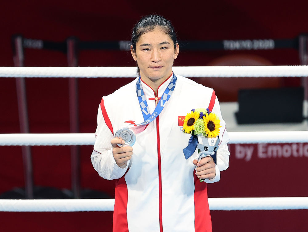 2021年8月8日,在东京奥运会拳击女子75公斤级决赛中,中国选手李倩获得银牌。新华社记者 王东震 摄