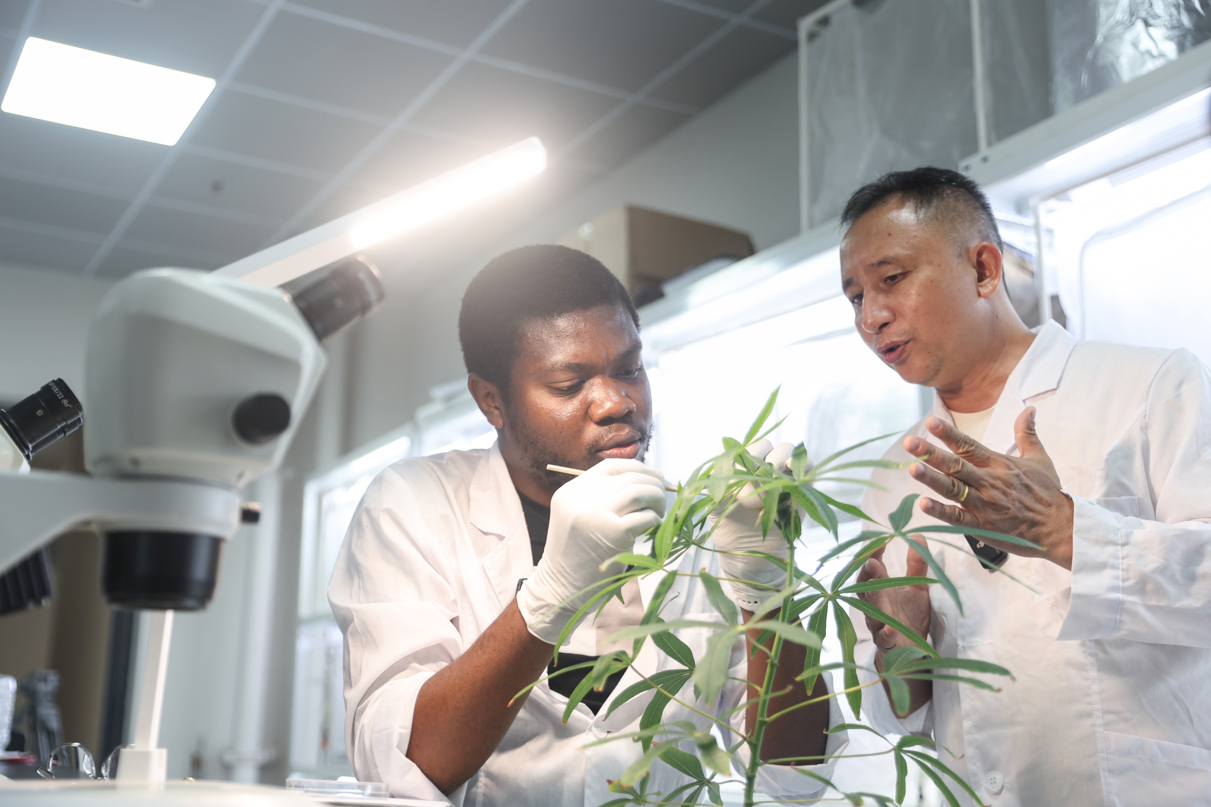 ↑在中国热带农业科学院三亚研究院里,二级研究员陈青(右)指导尼日利亚留学生格雷戈里开展木薯虫害绿色防控研究。