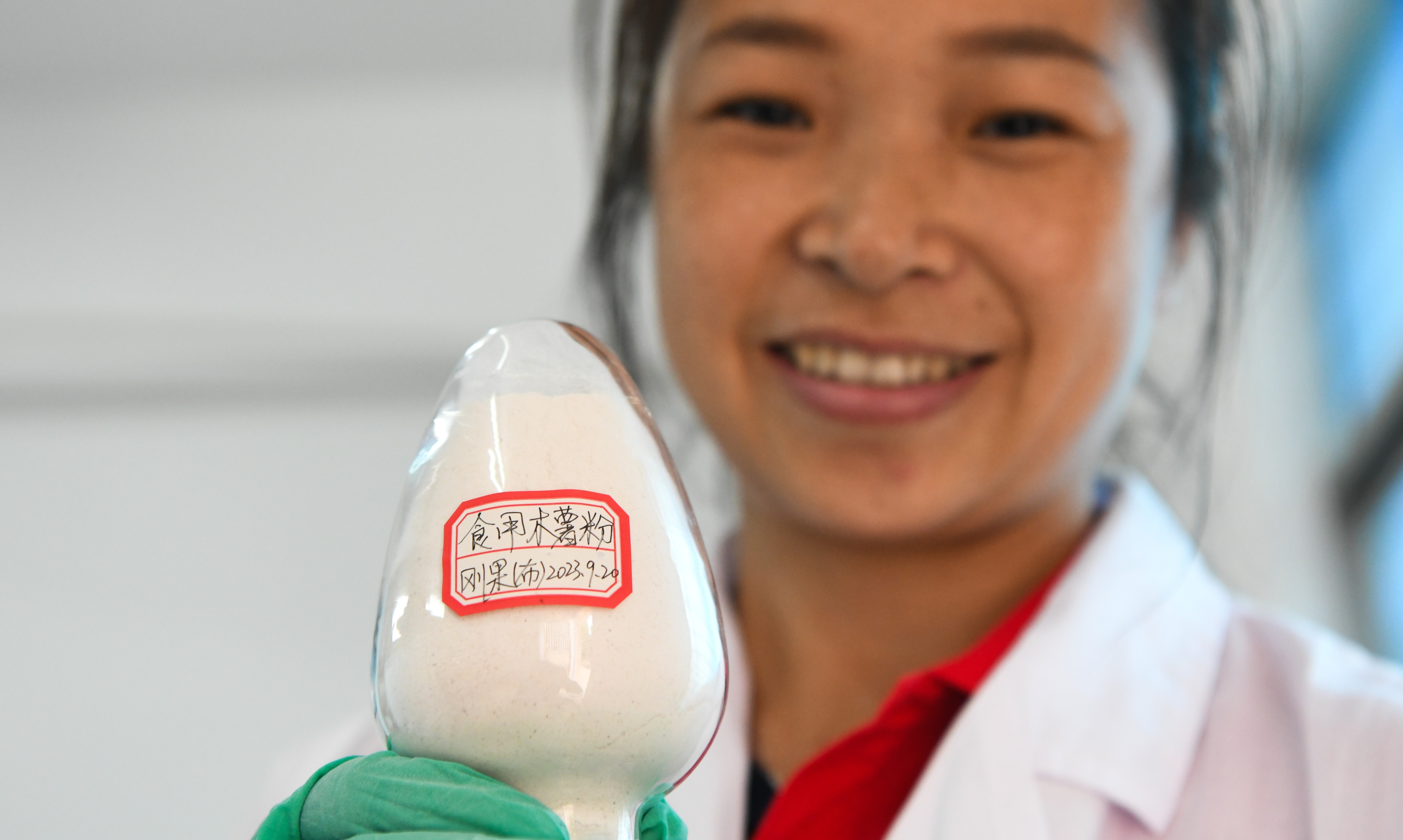 ↑2023年11月13日,科研人员在位于海南儋州的中国热带农业科学院热带作物品种资源研究所实验室展示从中国援刚果(布)农业技术示范中心寄回来的木薯粉。