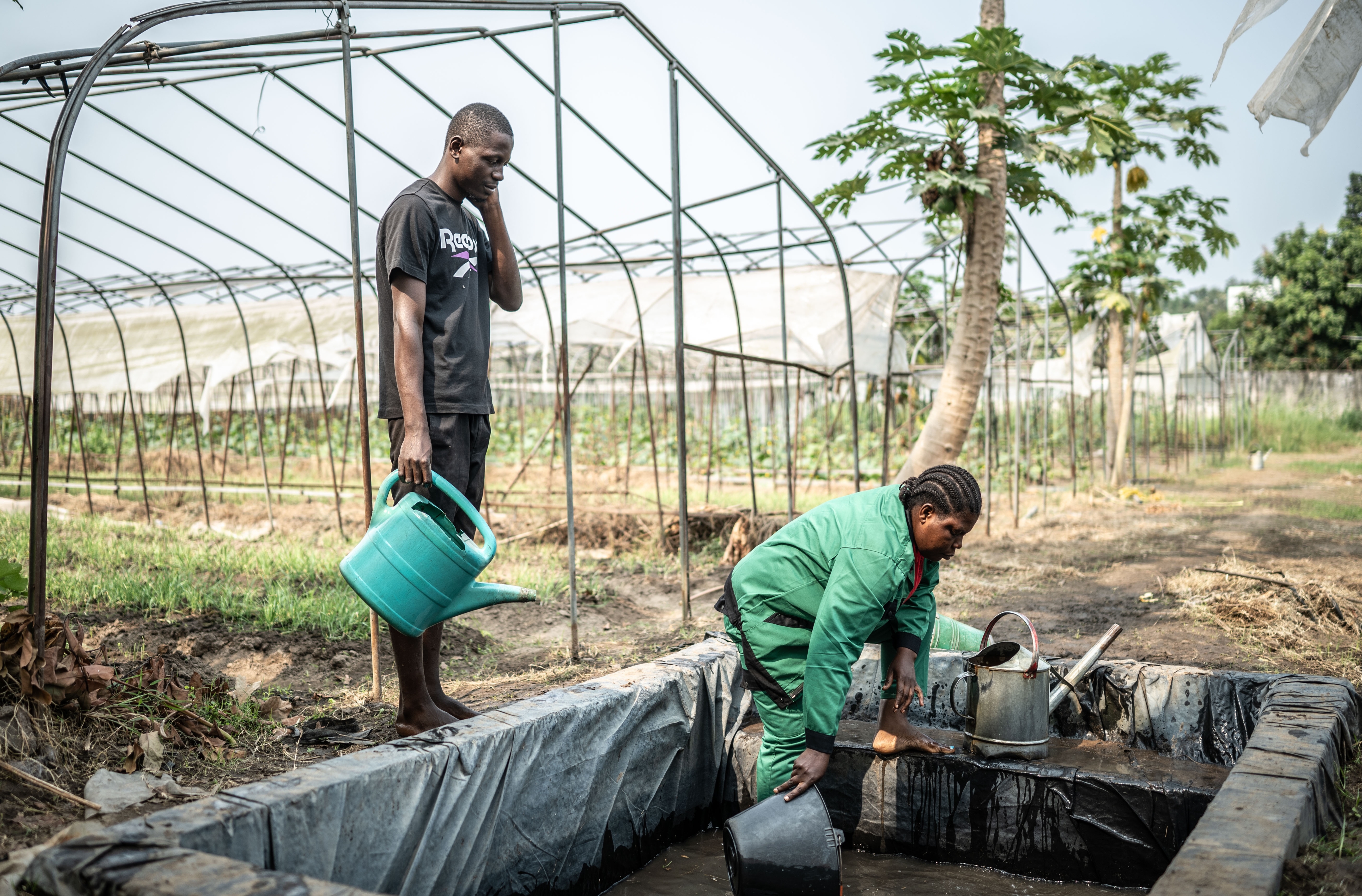 ↑在刚果(布)首都布拉柴维尔的中国援刚果(布)农业技术示范中心内,当地员工在取水准备浇灌。