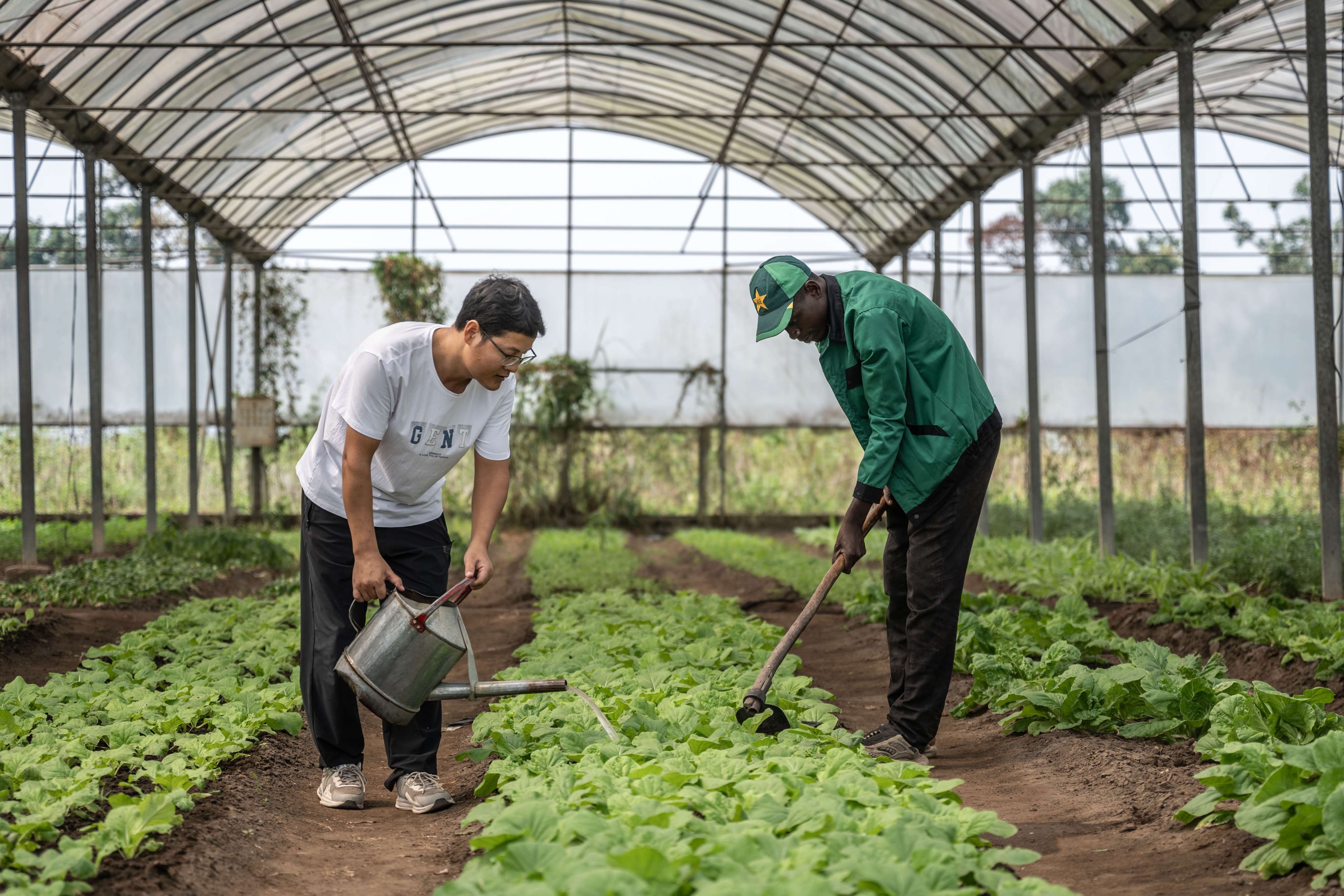 ↑在刚果(布)首都布拉柴维尔的中国援刚果(布)农业技术示范中心内,中方农业专家李科明与当地员工在大棚内耕作。