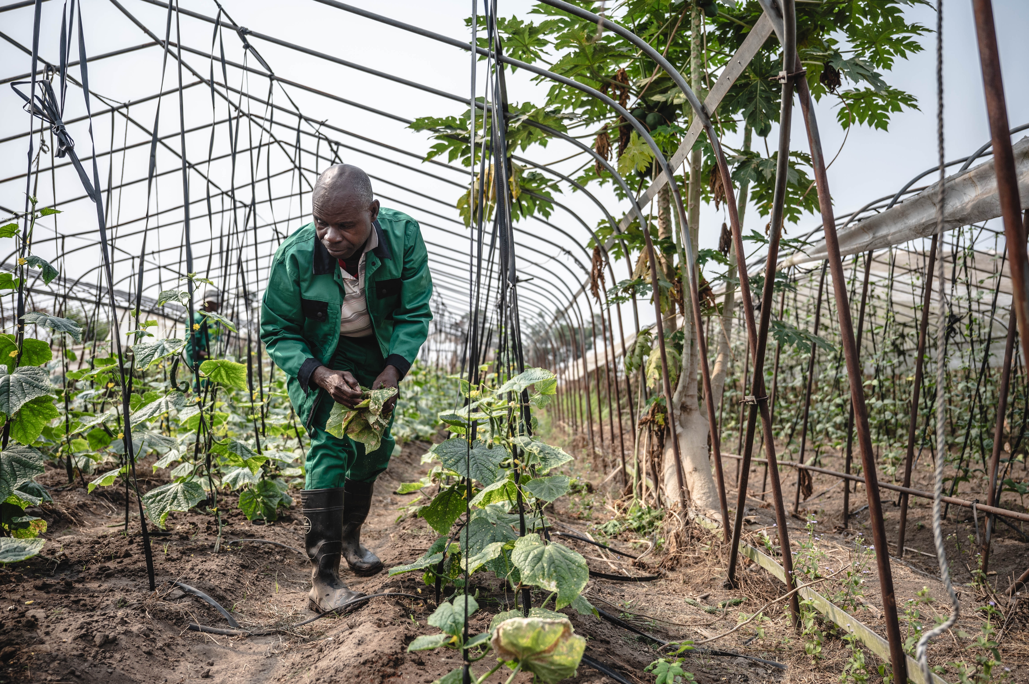 ↑在刚果(布)首都布拉柴维尔的中国援刚果(布)农业技术示范中心内,当地员工在大棚内查看黄瓜长势。