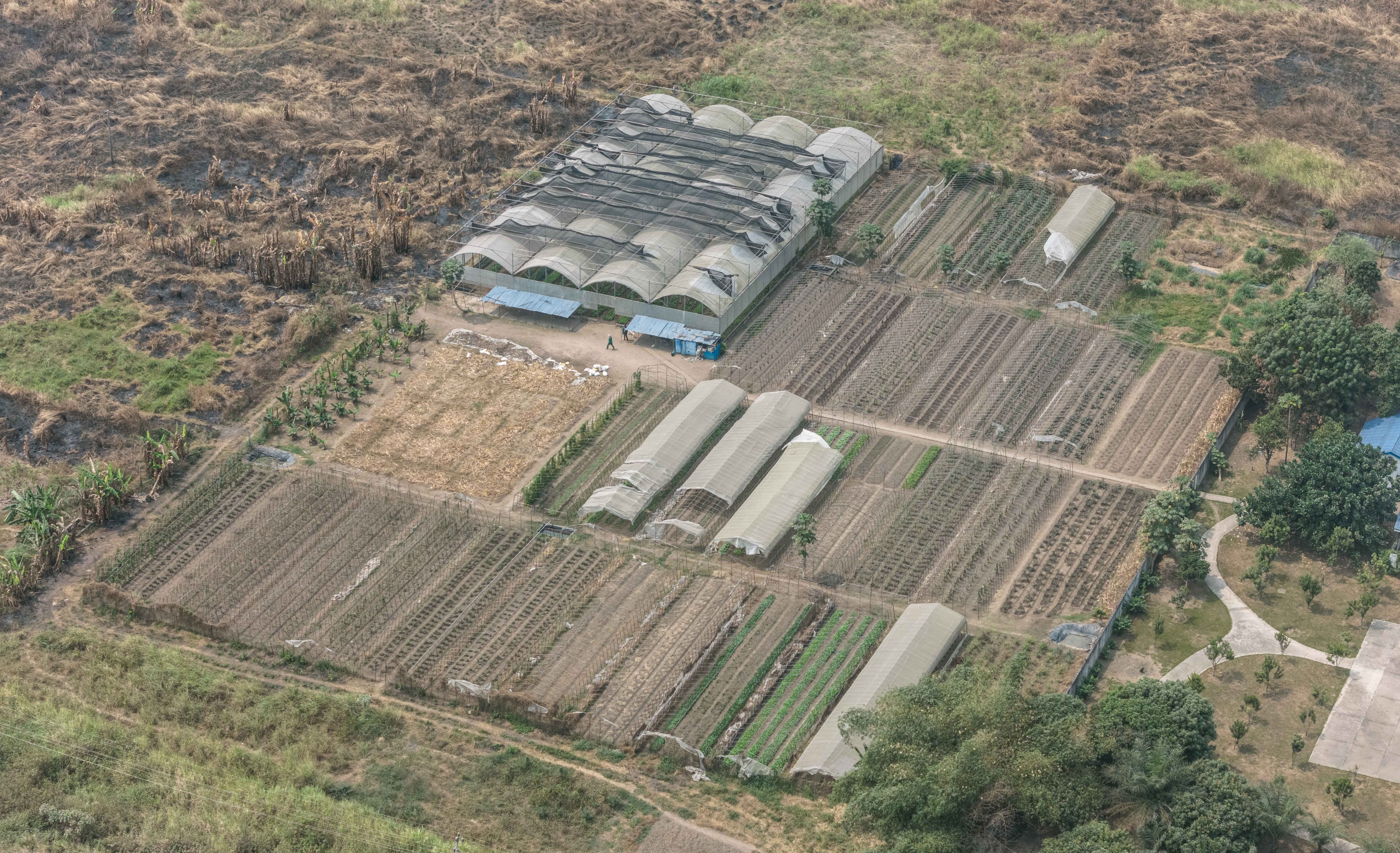 ↑这是位于刚果(布)首都布拉柴维尔的中国援刚果(布)农业技术示范中心大棚(无人机照片)。