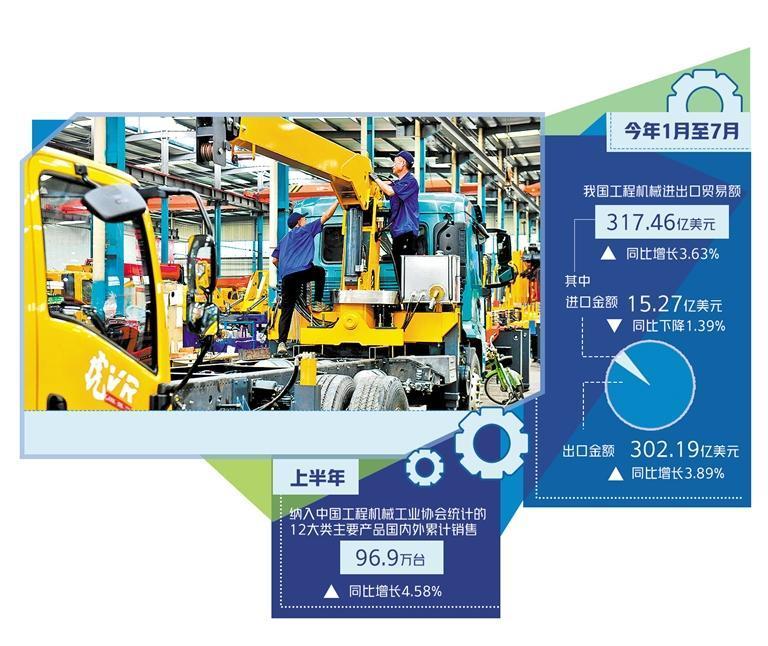 中国工程机械协会数据显示,上半年纳入协会统计的12大类主要产品国内外累计销售96.9万台,同比增长4.58%;其中,国内累计销售59.7万台,同比增长0.31%;出口累计销售37.2万台,同比增长12.3%。