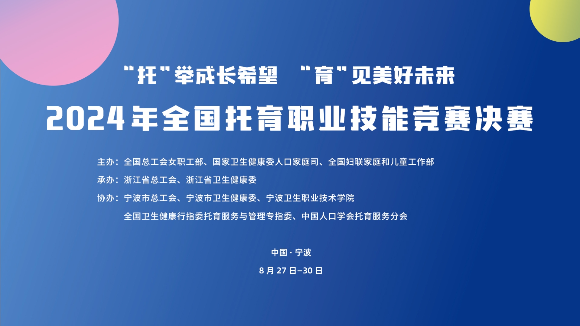直播回顾丨2024年全国托育职业技能竞赛决赛8月30日闭幕 由全国总工会女职工部、国家卫生健康委人口家庭司、全国妇联家庭和儿童工作部主办,浙江省总工会、浙江省卫生健康委承办的全国托育职业技能竞赛决赛将于2024年8月27日至30日在浙江宁波开赛。竞赛分为保育师(职工组)、保育师(学生组)和育婴员(职工组)3个赛道,面向广大保育、育婴工作者和职业院校相关专业学生广泛开展,聚焦托育服务人才培养,以赛促学,以赛促建。作为首次全国性托育职业技能竞赛,本次竞赛参赛选手多、关注度高、社会影响大,全国31个省级代表队高度重视此次竞赛,经省级初赛共选拔近300名选手参加决赛。8月30日9:00闭幕式,中工网首页、微博、抖音号、微信视频号、头条号同步直播。