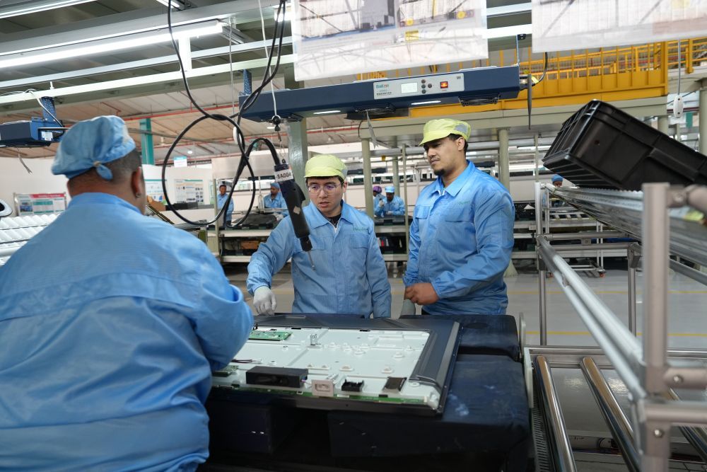 8月14日,在南非开普敦,中方工程师(中)在海信南非工业园的电视机生产线上指导当地员工工作。新华社记者王雷摄