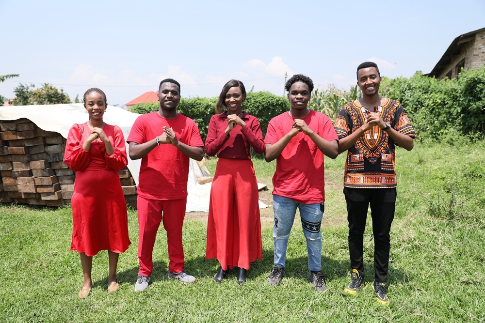 2024年2月7日,在卢旺达南方省卡莫尼地区,卢旺达青年团队成员向镜头前观众送上新春祝福。新华社发(黄万晴 摄)
