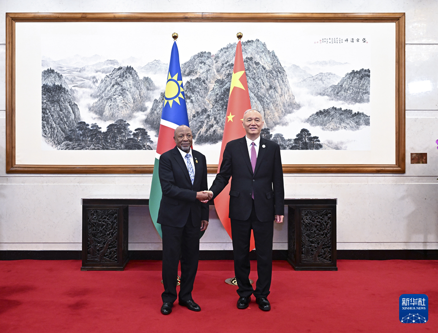 9月5日,中共中央政治局常委、中央书记处书记蔡奇在北京会见来华出席中非合作论坛北京峰会的纳米比亚总统姆本巴。新华社记者 燕雁 摄