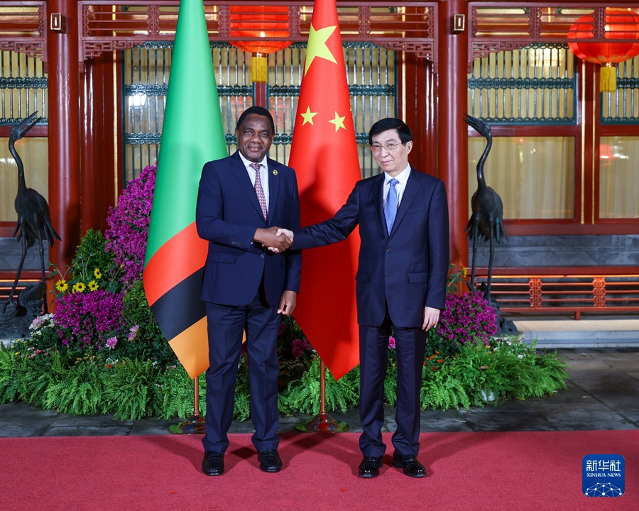 9月5日,全国政协主席王沪宁在北京会见来华出席中非合作论坛北京峰会的赞比亚总统希奇莱马。新华社记者 刘彬 摄