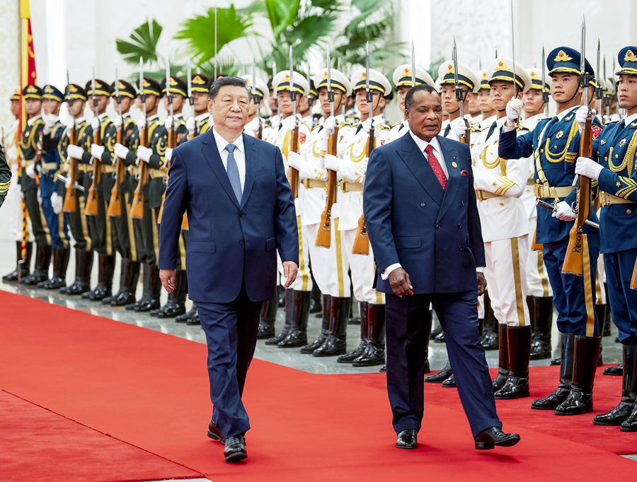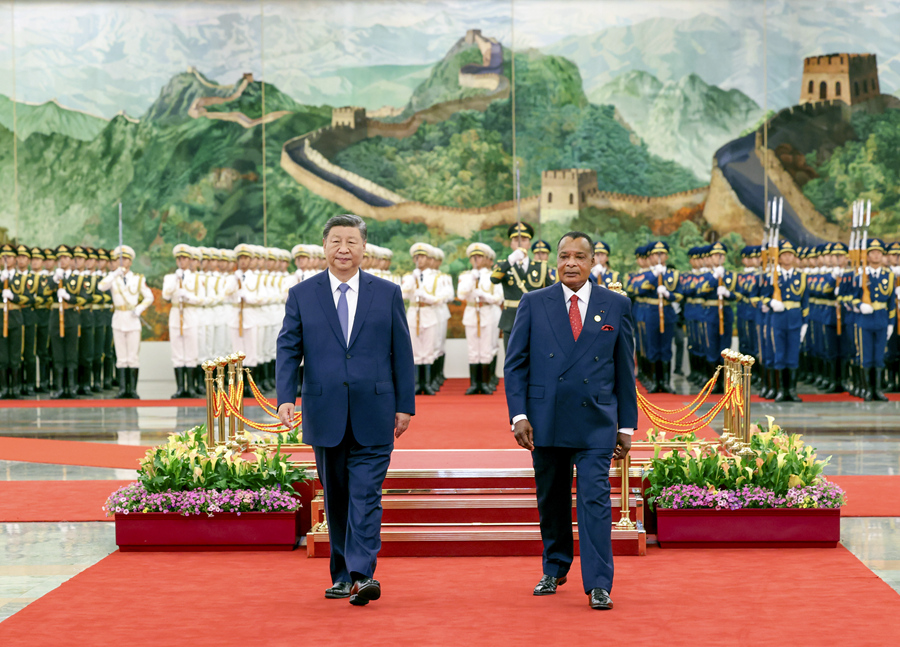 9月6日上午,国家主席习近平在北京人民大会堂同来华出席中非合作论坛北京峰会并进行国事访问的刚果(布)总统萨苏举行会谈。这是会谈前,习近平在人民大会堂北大厅为萨苏举行欢迎仪式。新华社记者 丁林 摄