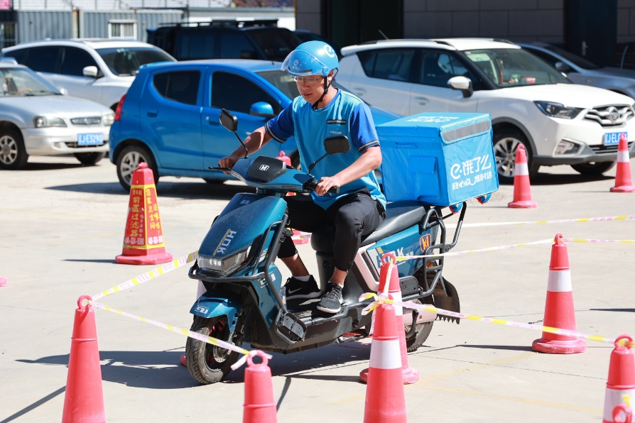 在驾驶技能培训现场,来自大连的高仁科和阜新的岳春龙正在练习。他们一边口述操作步骤,一边熟练地进行配送前准备。引人注目的是,他们练习的电动车脚踏板上有一杯装满水的刻度杯,这是为了考验选手驾驶技术平衡能力而特别设置的。经过S弯路、环岛路口等特殊线路的考验,高仁科和岳春龙的驾驶技能得到了充分锻炼。