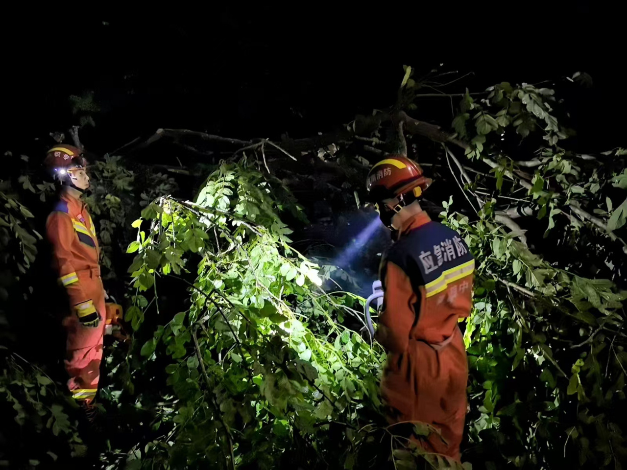 到达现场后,消防救援人员利用漏电探测棒对电线进行探测,随后用机动链锯、撬棒等工具对树干进行分解作业,并清理散落在路面的树枝、枝叶。25分钟后,顺利清理树干。