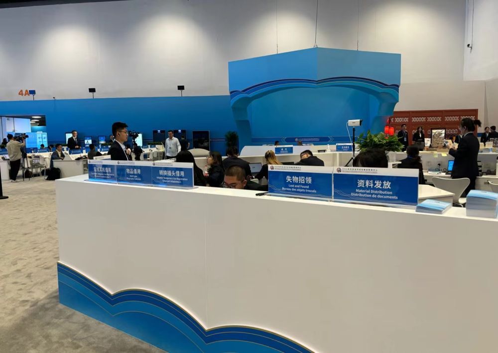 此次峰会期间,设有两处综合服务台,彬彬有礼的志愿者们为中外媒体朋友提供了咨询导览以及“失物招领”“物品借用”等后勤保障。