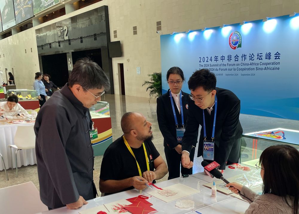 在峰会新闻中心的走廊上,并排设置有景泰蓝、哈氏风筝、彩塑京剧脸谱、花丝镶嵌等非遗文化体验区。不少非洲朋友“邂逅”中国传统文化,与志愿者共同制作中国非遗礼物,感受文化交流的魅力。