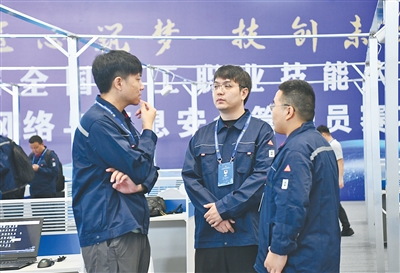 9月10日,网络与信息安全管理员赛项参赛选手常杰(中)、郝鹏(左)、吴帅胜(右)熟悉场地后,在现场交流讨论。河北工人报记者 林峰 摄