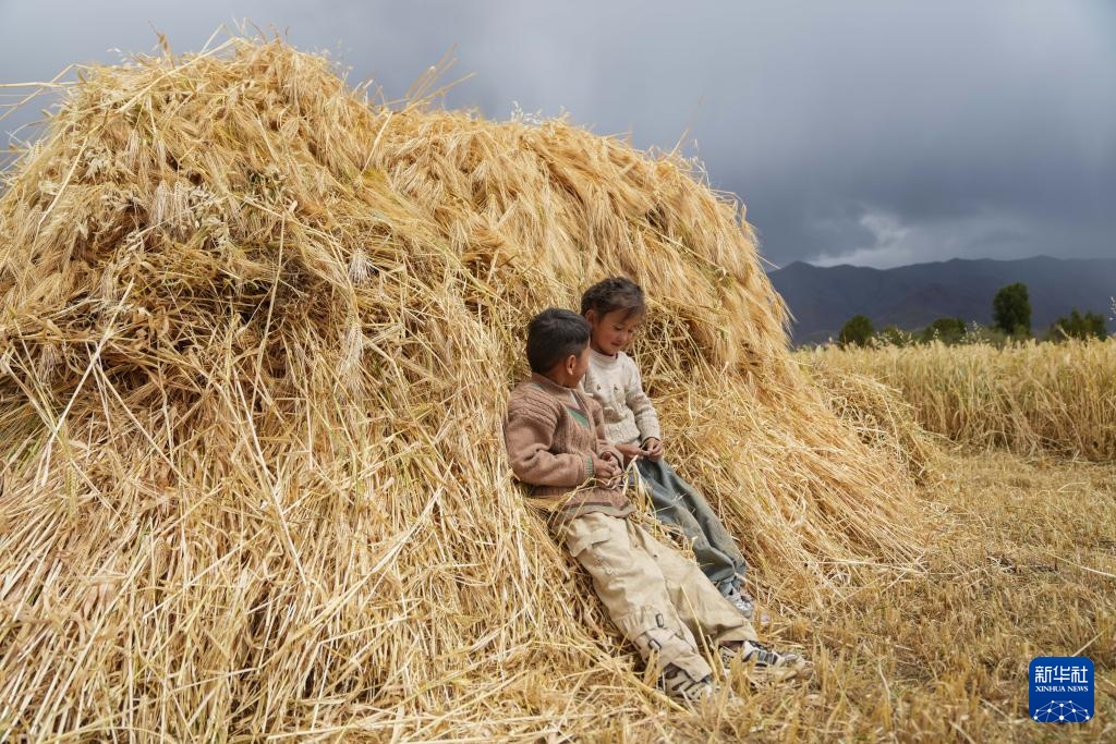 9月10日,在西藏日喀则市白朗县巴扎乡,孩子们靠在青稞垛上玩耍。新华社记者 晋美多吉 摄