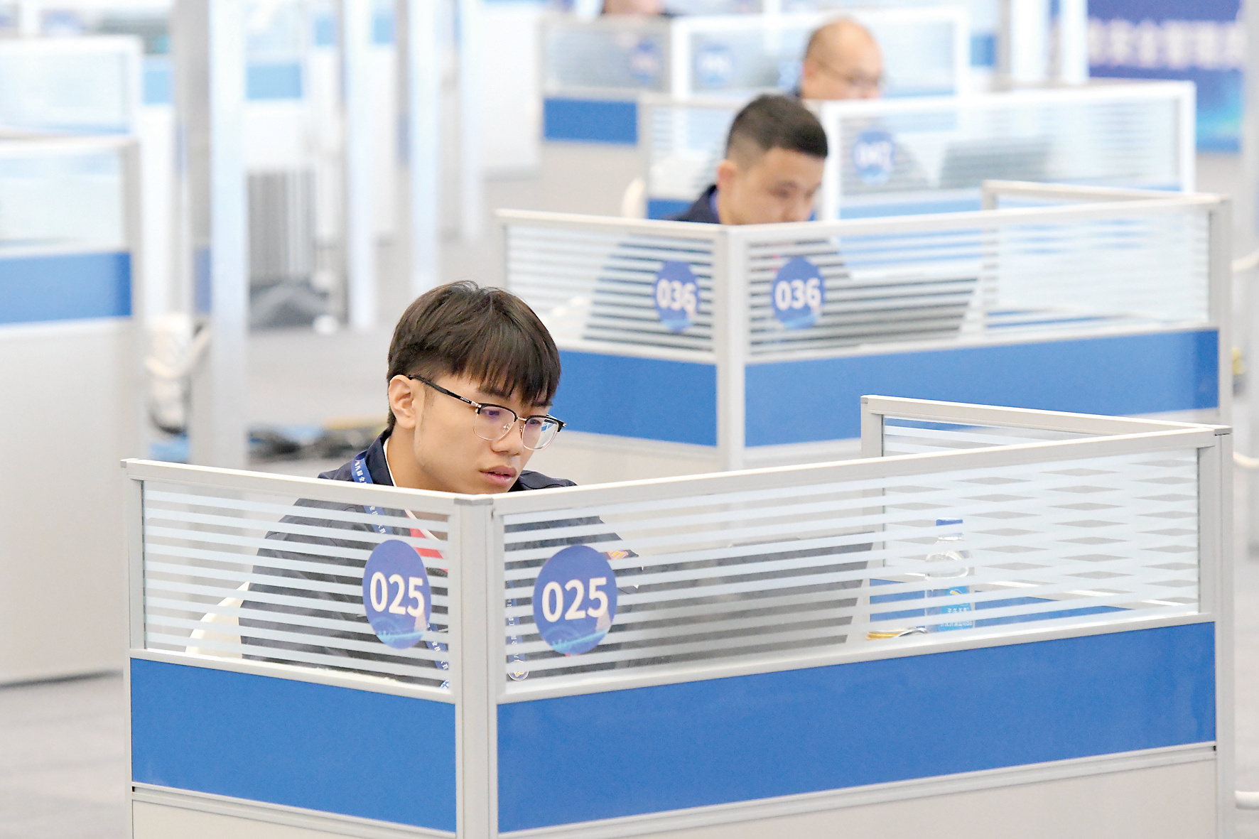 在设置了屏蔽仪的考场中,身着统一工服的选手们正在网络世界隔空“厮杀”。他们沉着冷静,在自己的工位上有节奏地敲击着键盘。电脑屏幕上飞快跳动的字符透露出战况的激烈。