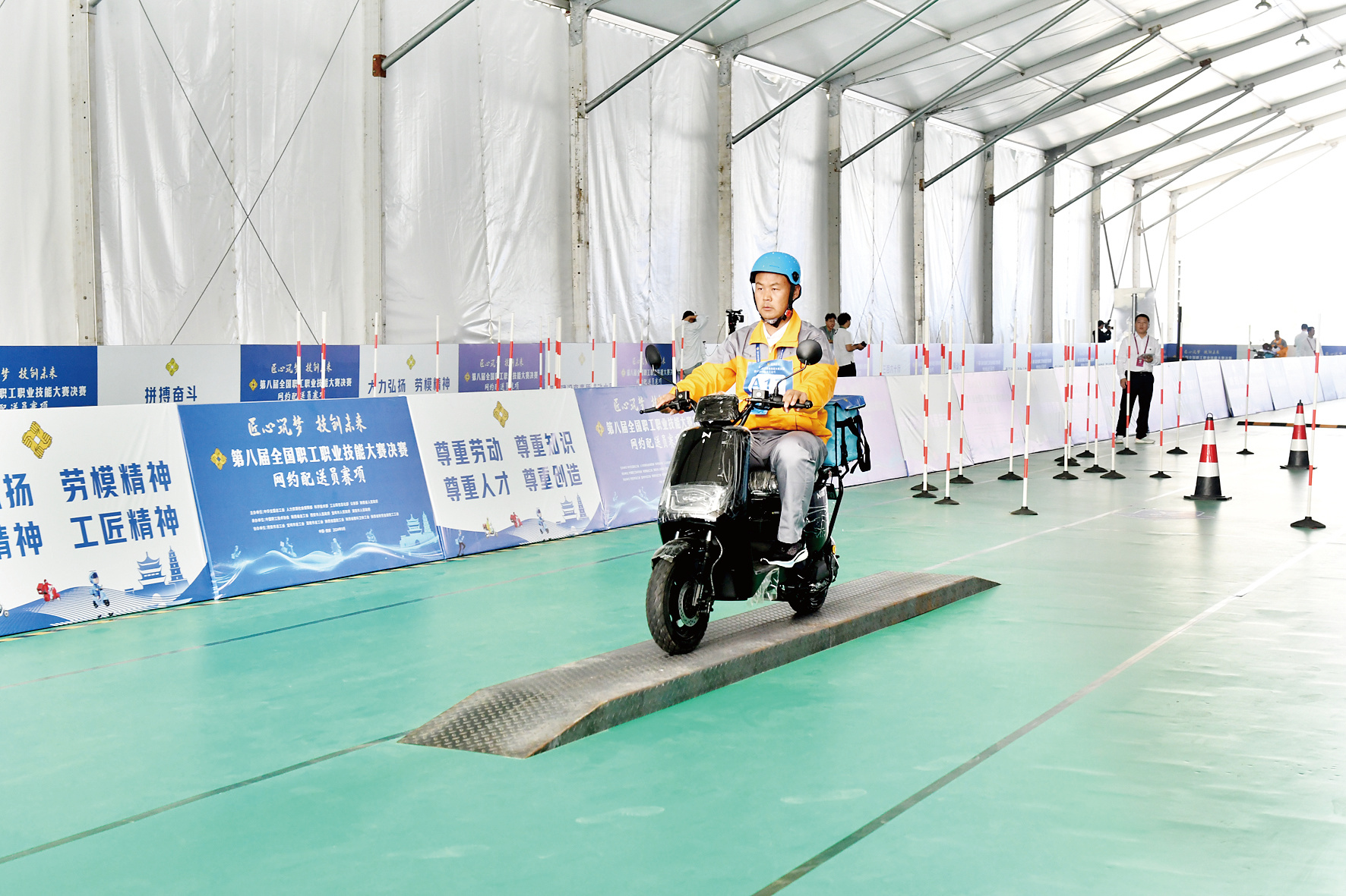 参加网约配送员赛项的选手全神贯注过单边桥。