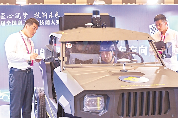在汽车维修工(智能网联新能源汽车方向)赛项比赛现场,天津选手正在聚精会神地完成智能网联新能源汽车场景仿真测试,他们精神抖擞、沉着应战。赛后,选手周常君说:“这次比赛无论是自动驾驶程序的数据读取还是程序的改写编辑,都充分全面地考察了选手的综合能力。回津后,我要把大赛中见到的新技术、新思路带给同事们,与他们共同进步。”
