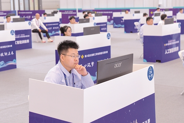 在人工智能训练师赛项现场,近百个工位星罗棋布,来自天津的三位选手蔺金泉、宗祥瑞、马剑在各自工位上紧盯屏幕,时而敲击键盘、时而皱眉思索。随着时间的推移,一行行代码流畅地被他们编写出来,作为指令输送给人工智能(AI),让它从什么也不懂的“小白”,变成能帮助人们更好地享受生活的“智多星”。