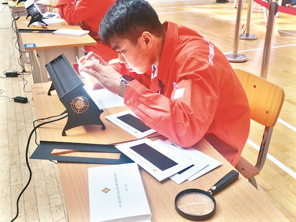 图③:参加焊工赛项比赛的选手全神贯注进行焊缝X光片判读。
