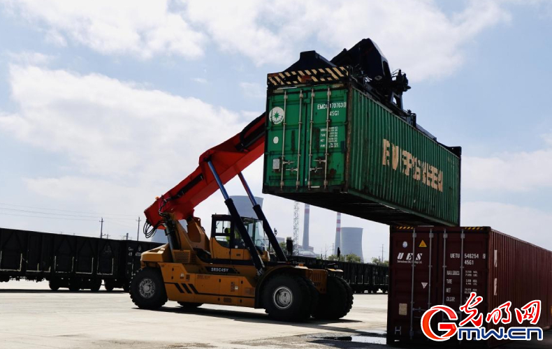 七苏木国际物流枢纽产业园内正在进行中欧班列集装箱装车作业。光明网记者 刘晗旭摄