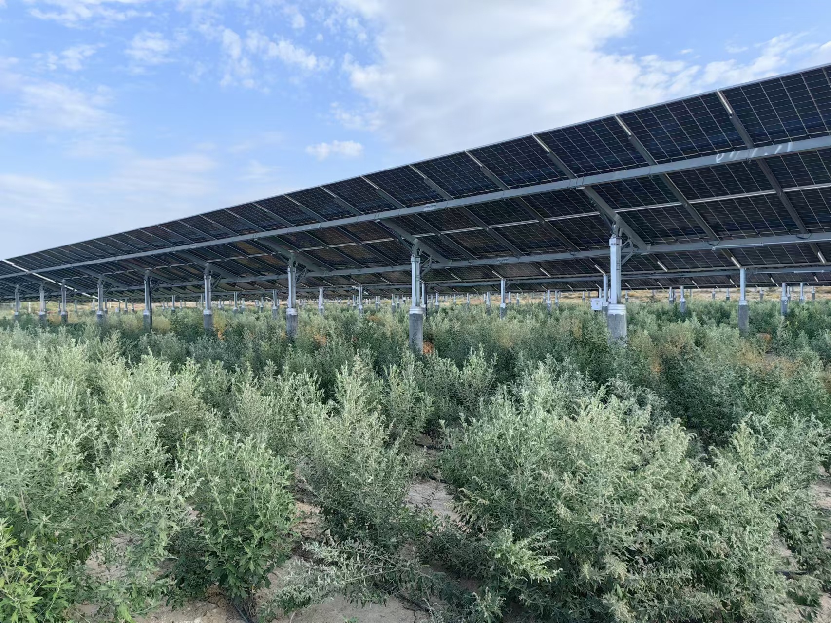 记者看到,光伏板下,高度约1米的艾草郁郁葱葱,有的已经开花结籽,在茫茫荒漠里染出片片惹眼的绿色。