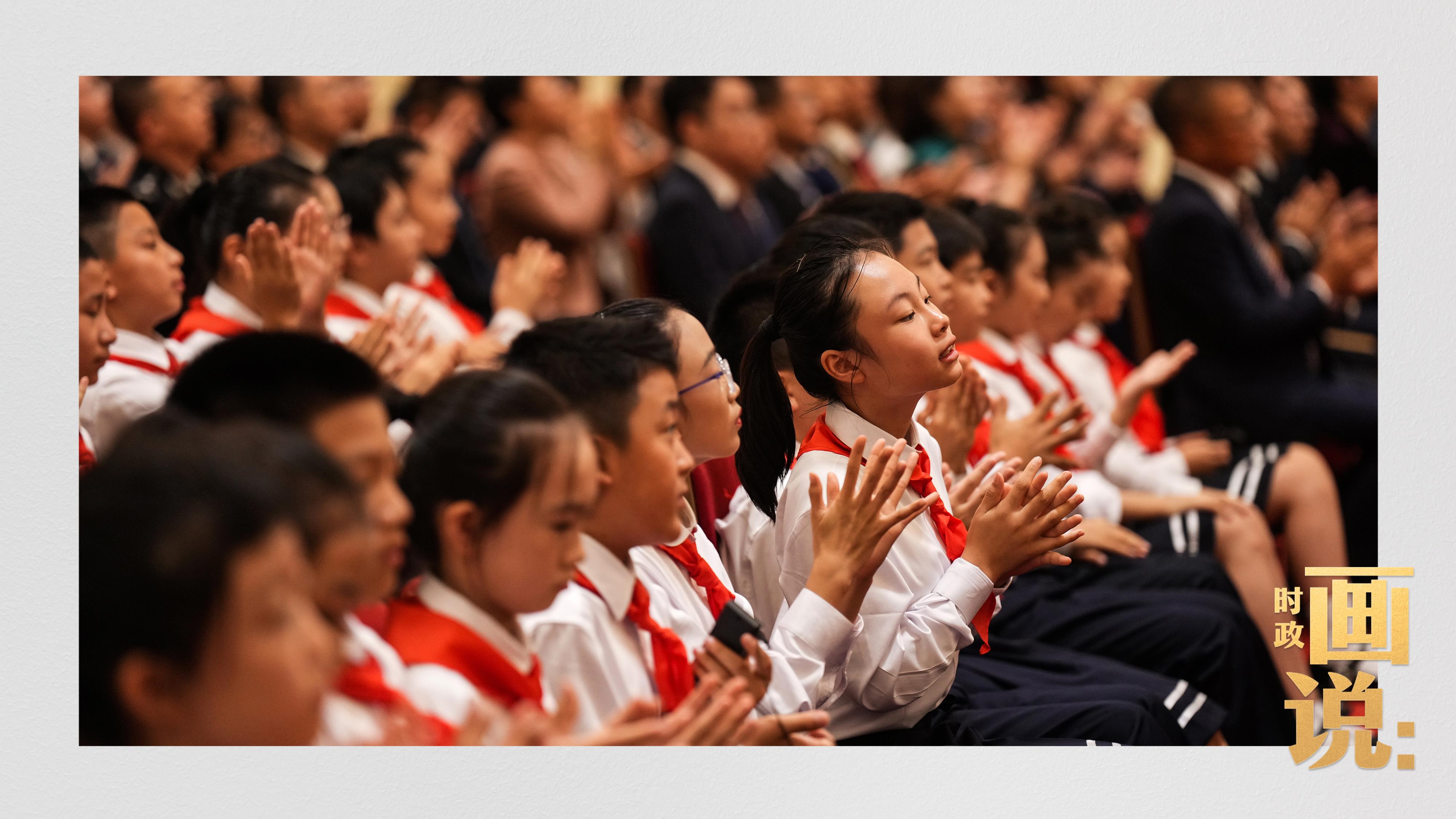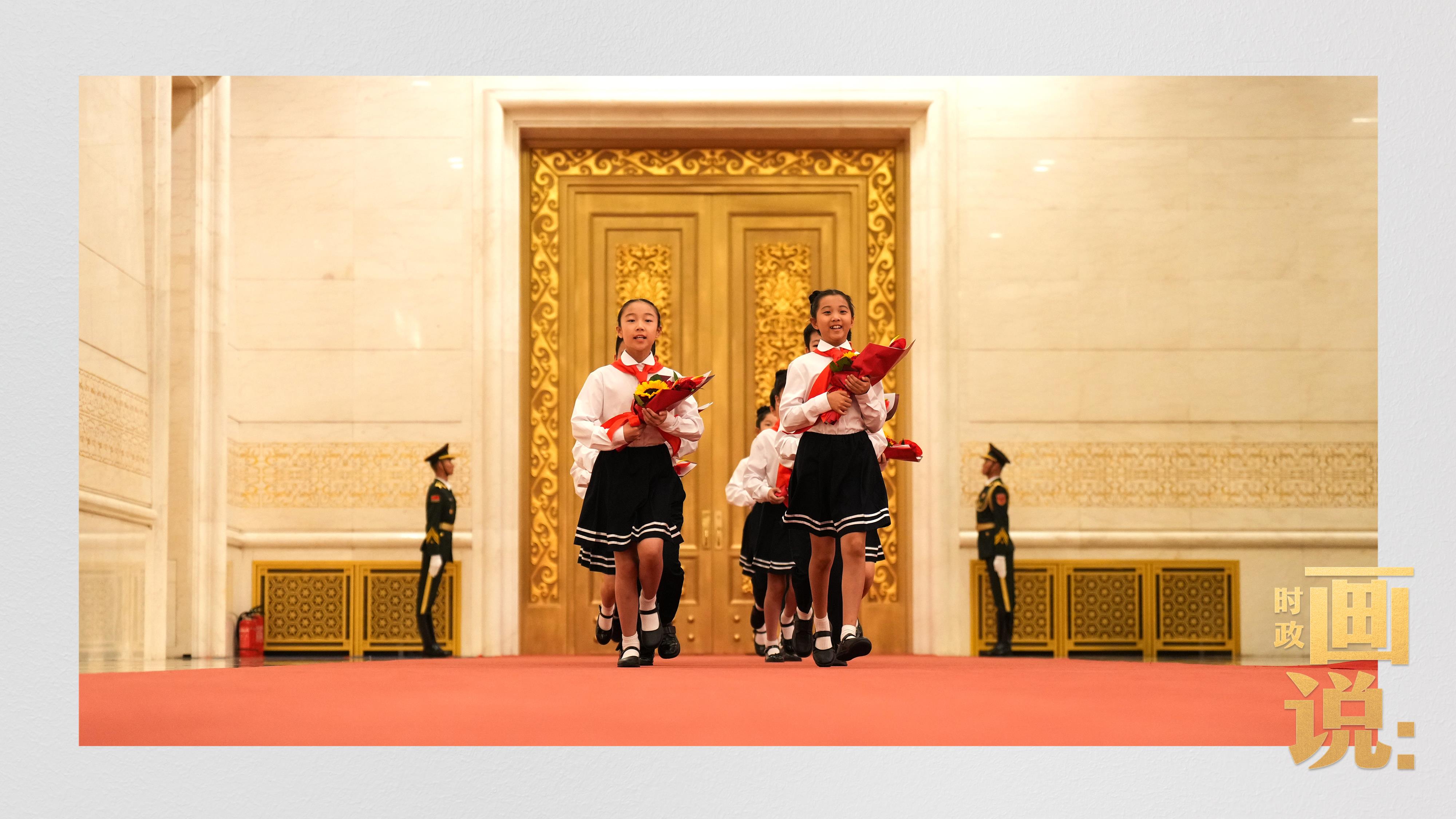 △少先队员向国家勋章和国家荣誉称号获得者献花。
