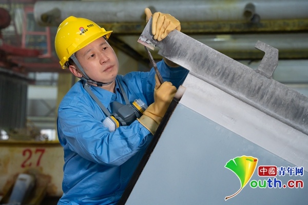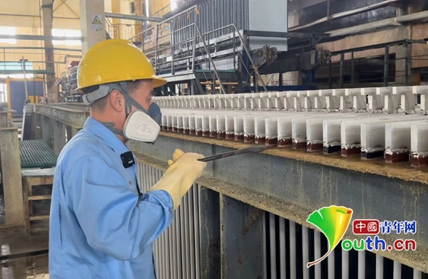 柳祥国在检查阴极板导电头。中国青年网记者 高蕾 摄