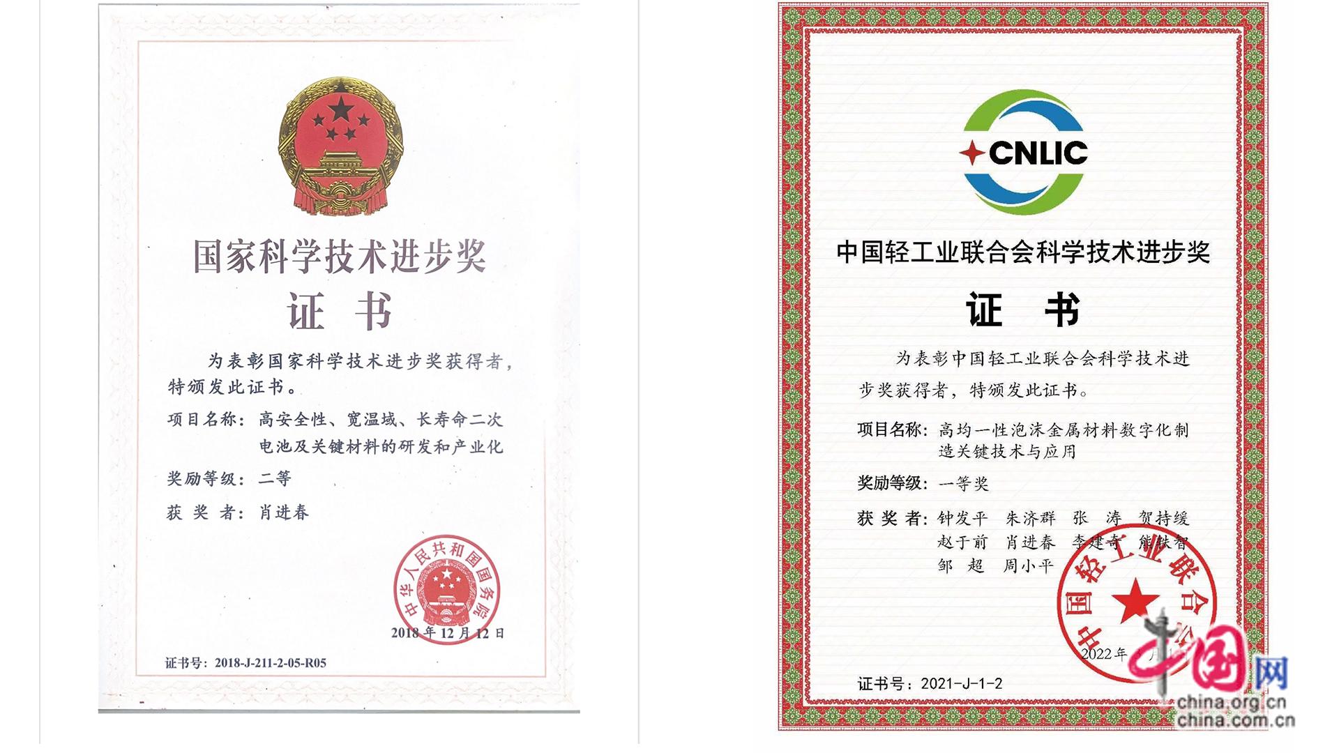 回顾自己在常德力元26年的在职业生涯,肖进春共获得了25项发明专利授权,参与了多项科研项目并多次获得国家级和省级科学技术进步奖。其参与的《高安全性、宽温域、长寿命二次电池及关键材料的研发和产业化》获得了国家科学技术进步奖二等奖,《高均一性泡沫金属材料数字化制造关键技术与应用》获得了中国轻工业联合会科学技术进步奖一等奖。其主持的《镍氢电池电极低成本改善》荣获“2022年度轻工业行业职工优秀技术创新成果”荣誉。