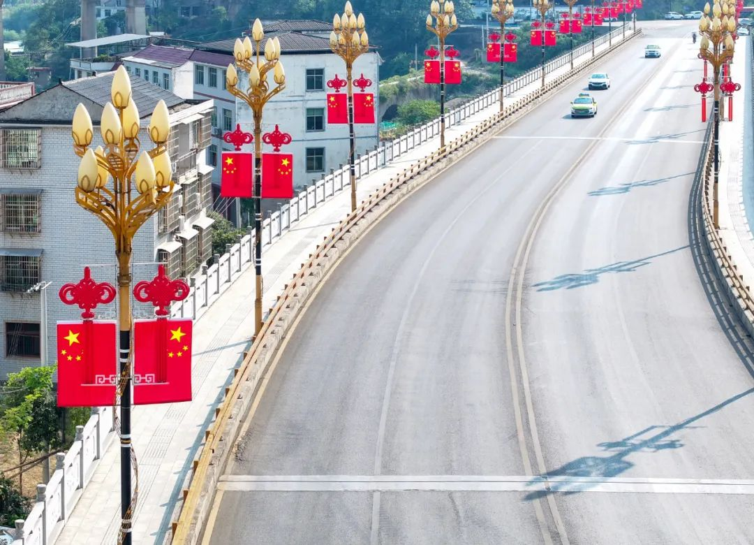 9月26日,贵州省铜仁市玉屏侗族自治县七眼桥上国旗招展,节日氛围浓厚。