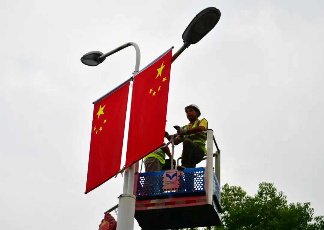 国庆佳节,在三峡库区湖北省宜昌市秭归县茅坪镇街头,工人们抓紧时间悬挂国旗,营造出欢乐祥和的喜庆气氛。