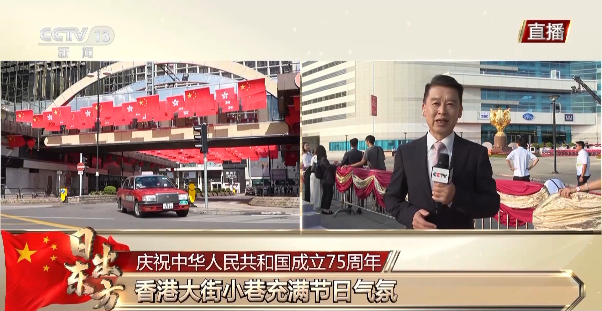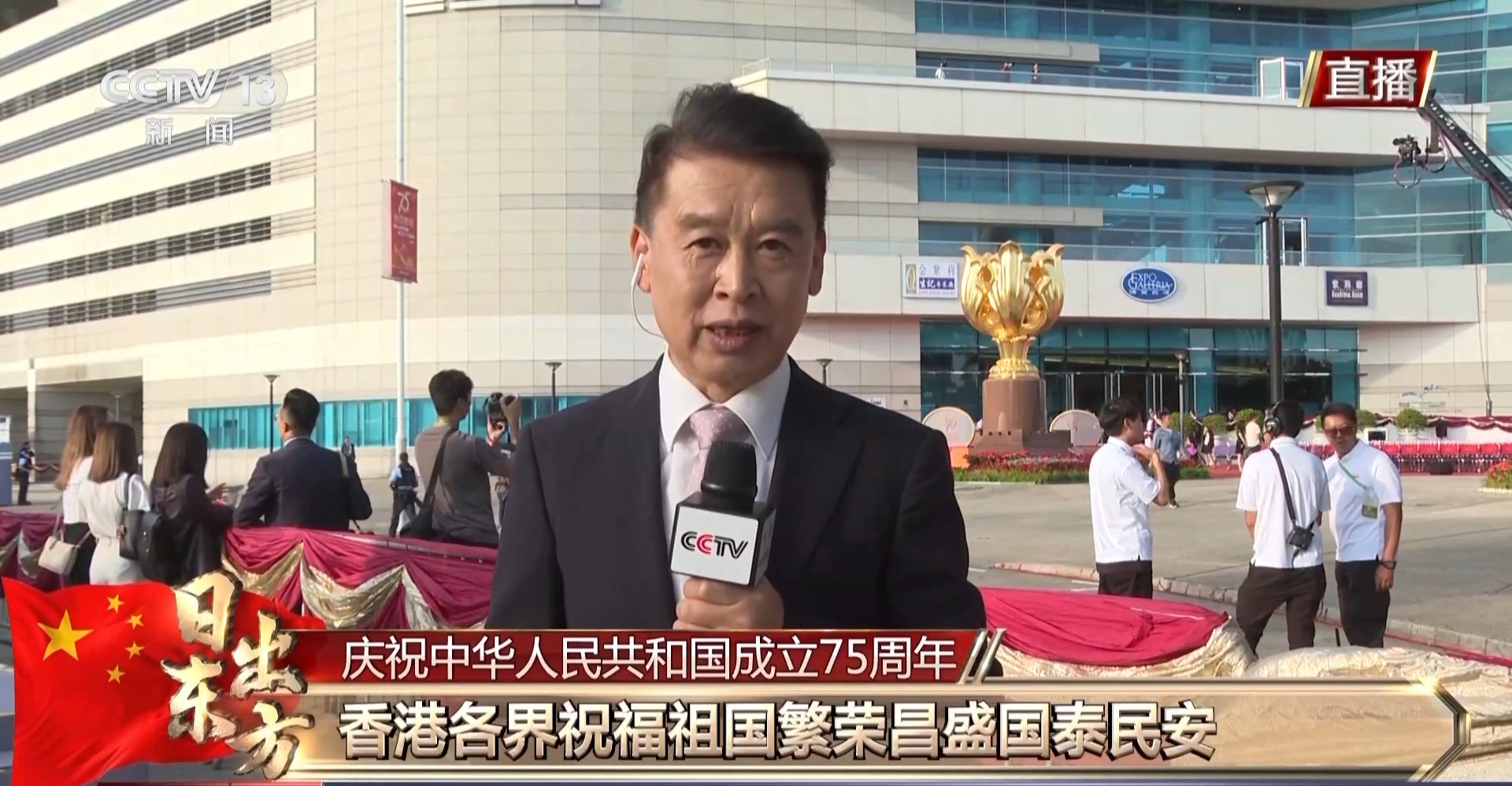 总台记者 金东:我现在是在香港金紫荆广场,今天8时,香港特区政府将在这里举行升旗仪式,随后还将在会展中心大会堂举行国庆酒会,庆祝中华人民共和国成立75周年。