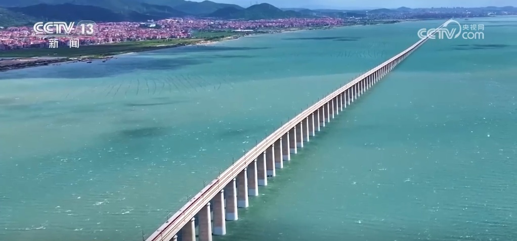 这是我国首条设计时速350公里的跨海高铁——福厦高铁湄洲湾跨海大桥。碧波之上,大桥气势恢宏,连接两岸。在跨海大桥上行车,受海上风力影响很大,通过这样的路段通常需要减速慢行。但福厦高铁实现了“跨海过桥不减速”,在不设风屏障等防风措施下,列车可在8级大风下以时速350公里速度行驶。国庆假期,福厦高铁加开195趟列车,满足旅客出行需求。