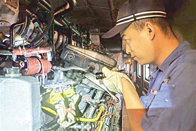 国庆期间,随着多趟机车加开,机车质量卡控更为严格。在轰鸣声中,孟凡东熟练地确认操作台各仪表显示状态,随后进行启机后的巡视,在机械间他一边检查着柴油机,一边口述检查内容:“油底壳无异物,曲轴可见部分无拉伤,连杆无断裂。”他的目光专注,动作干净利索。