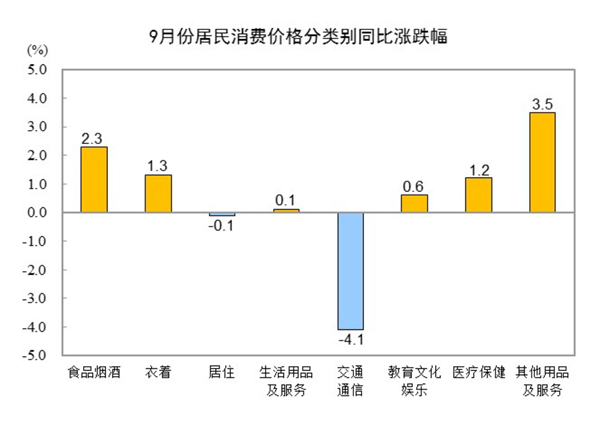 9月份,全国居民消费价格环比持平。其中,城市下降0.1%,农村上涨0.1%;食品价格上涨0.8%,非食品价格下降0.2%;消费品价格上涨0.2%,服务价格下降0.3%。