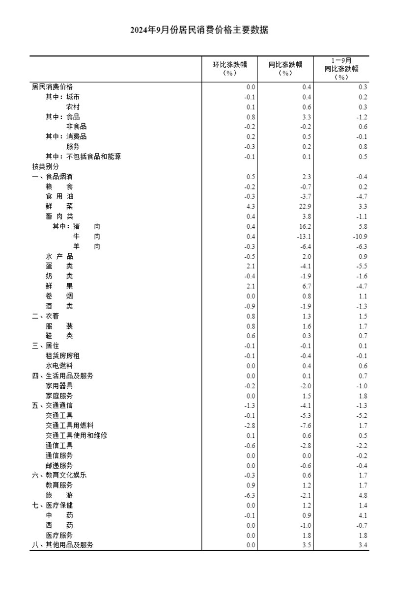 原标题:2024年9月份居民消费价格同比上涨0.4%