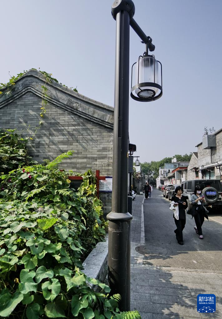 全部实现架空电线入地的钟楼湾胡同安装的古色古香的路灯(10月12日摄)。新华社记者 李欣 摄