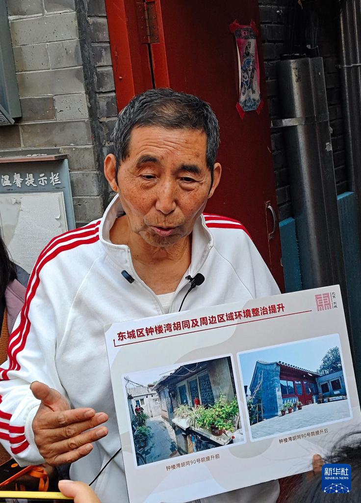 10月12日,钟楼湾胡同90号的居民范来友在展示改造前后的钟楼湾胡同照片。新华社记者 李欣 摄
