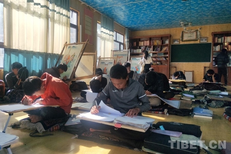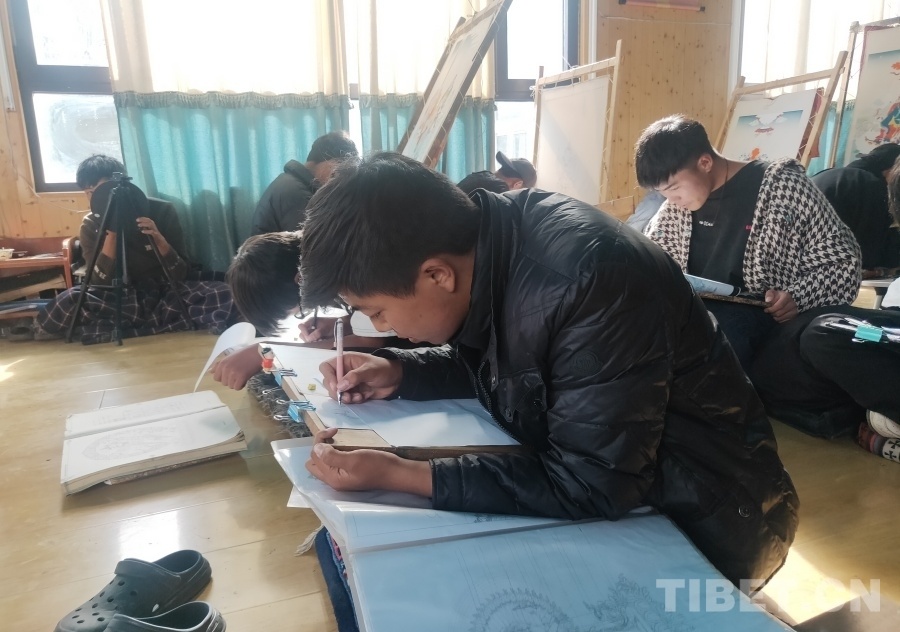 图为更嘎东周在练习唐卡白描 摄影:周晴晴