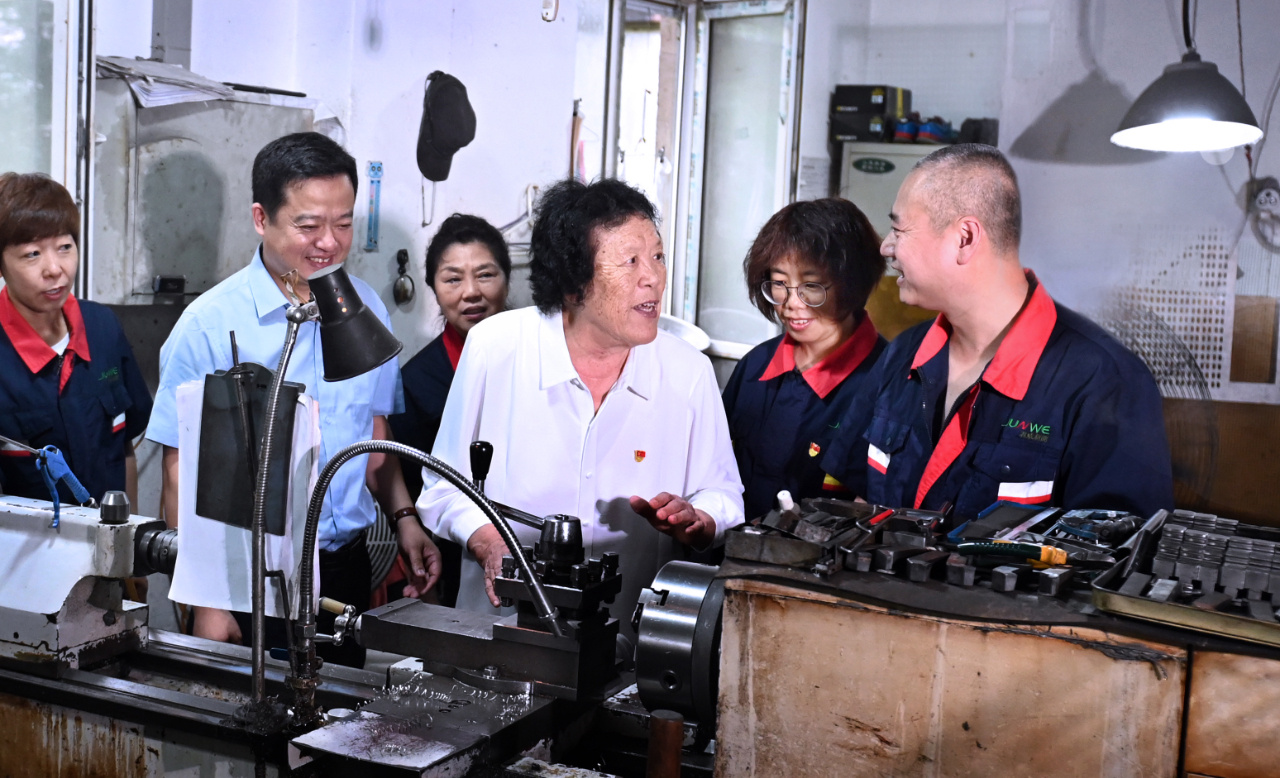 7月12日,辽宁沈阳,尉凤英走进沈阳君威新能科技有限公司,在车间与工人交流。