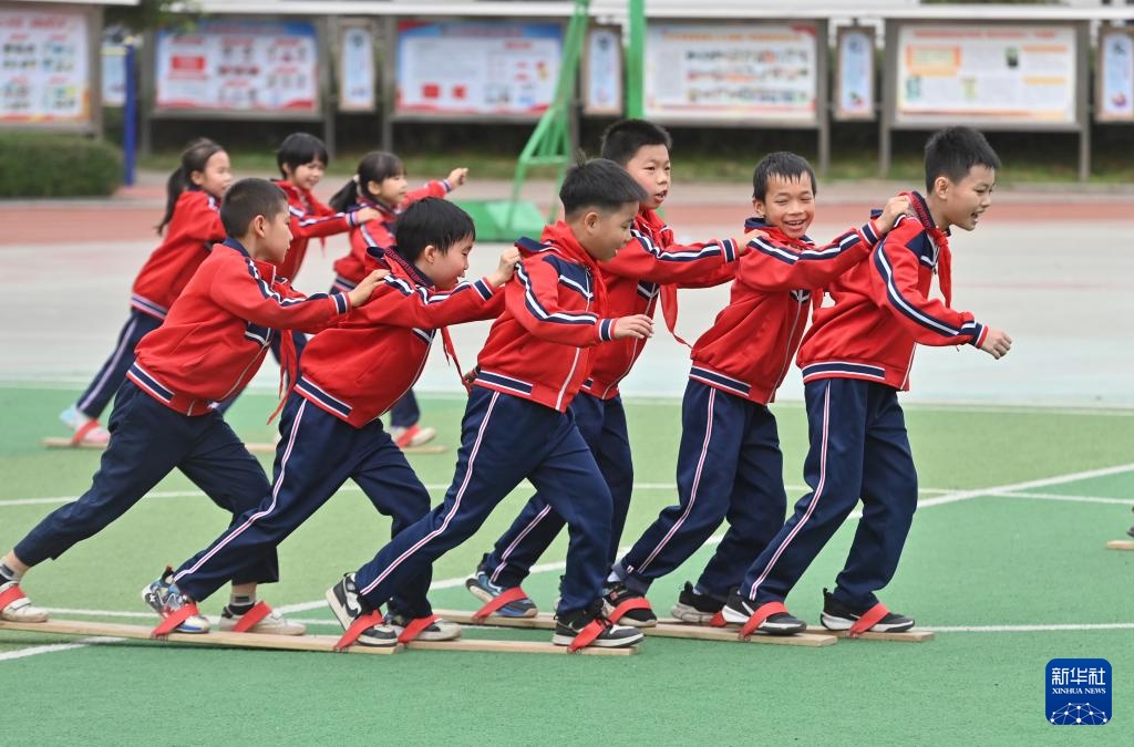 在梧州市龙平小学,学生们在体育大课间进行板鞋竞速练习(3月26日摄)。新华社记者 黄孝邦 摄