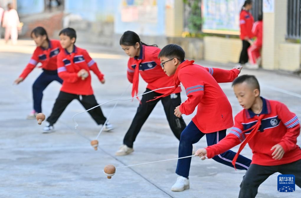 在梧州市大桥小学,学生们在体育课上练习打陀螺(10月25日摄)。新华社记者 黄孝邦 摄
