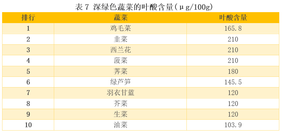 深绿色蔬菜富含叶酸,孕期如果缺乏叶酸,胎儿容易神经管畸形,虽然食物中的叶酸遇热、遇酸容易损失,但也是叶酸补充的一个途径。