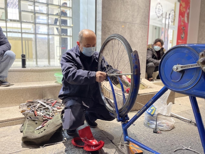 孔胜东在中山北路义务服务点为民修车。受访者供图