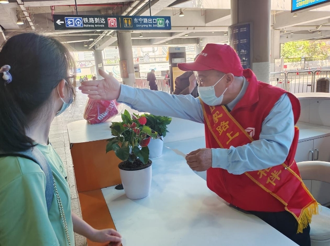 孔胜东在火车东站东广场为乘客指路。受访者供图