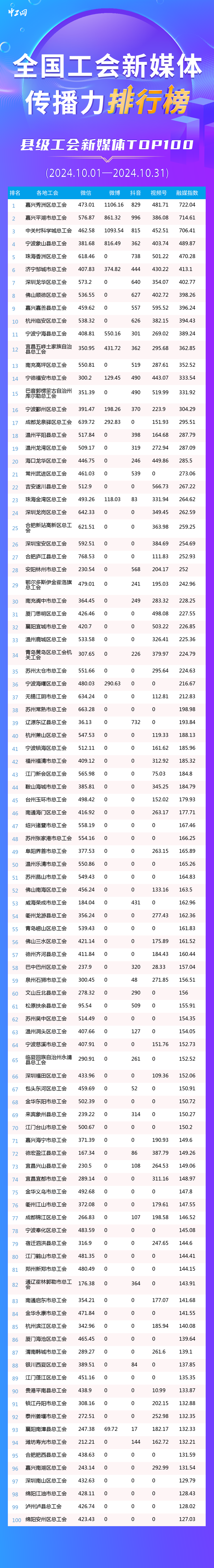 10月全国县级工会新媒体传播力TOP100发布: