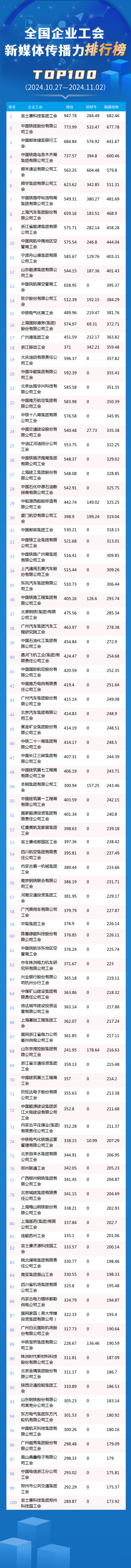 全国企业工会新媒体传播力排行榜TOP100